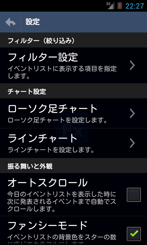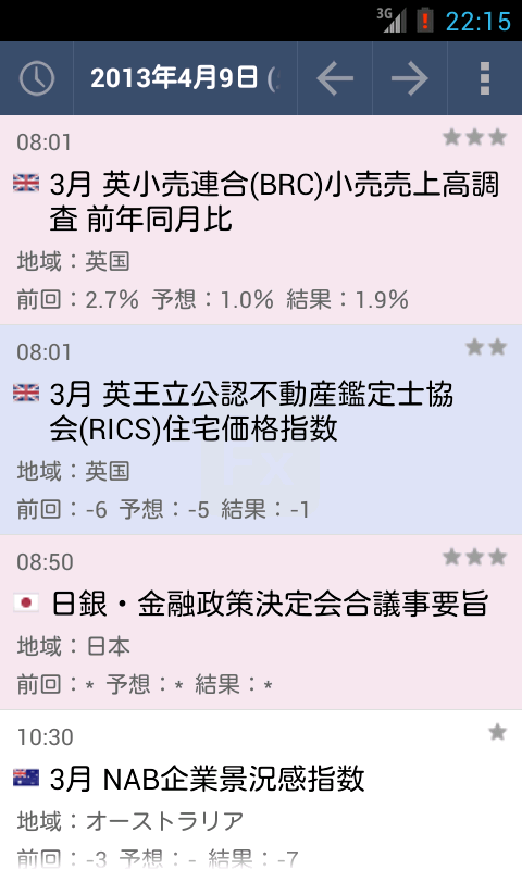 経済イベントを日毎にまとめてリスト表示。表示内容は重要度と地域を指定したフィルタリング、重要度に応じた色分け設定が可能です。