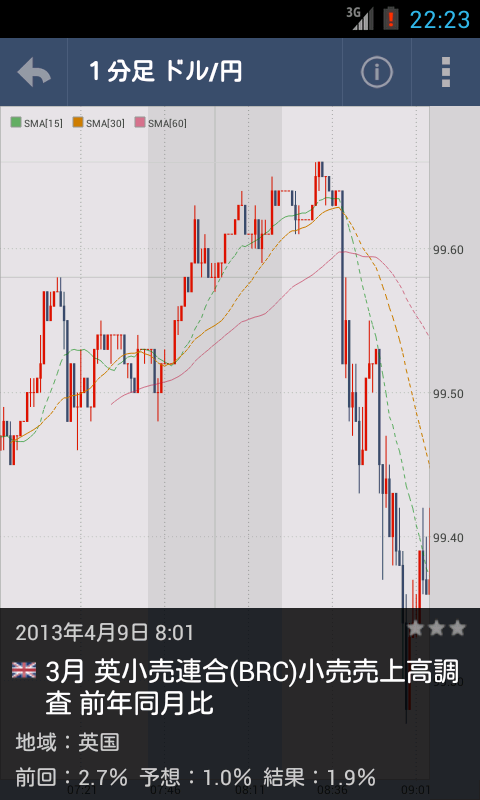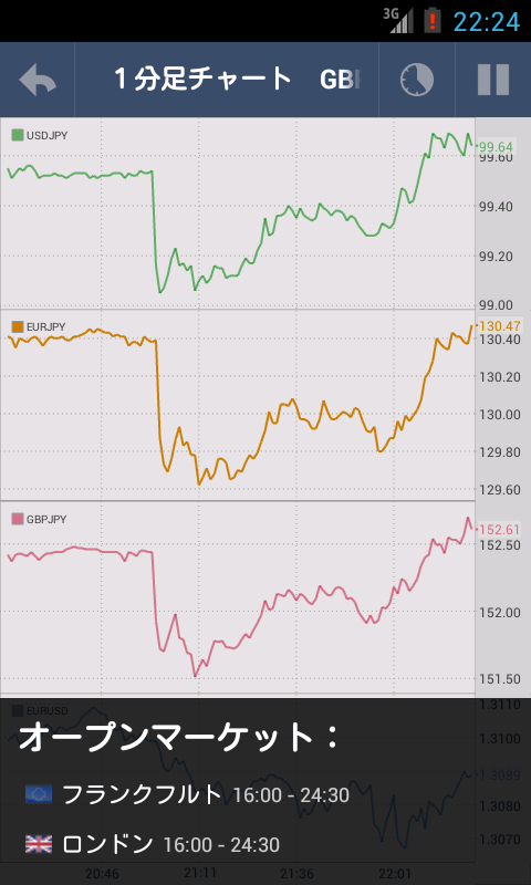 経済イベントをタップして前後のチャートをプレビュー。また、USDJPY、EURJPY、GBPJPY、EURUSDの4通貨ペア一括表示の1分足リアルタイムチャートも搭載しています。